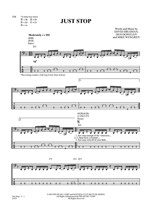 Digital Sheet Music for Just Stop by Disturbed, Mike Wengren, Dan Donegan, David Draiman scored for Bass Tab; id:357776