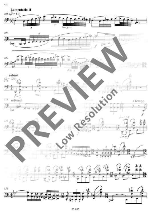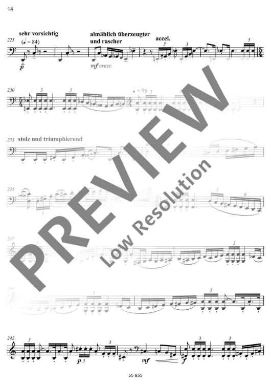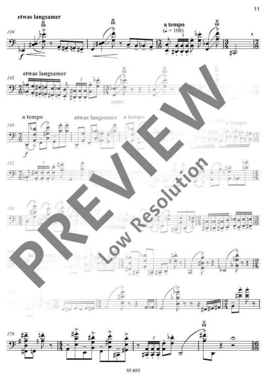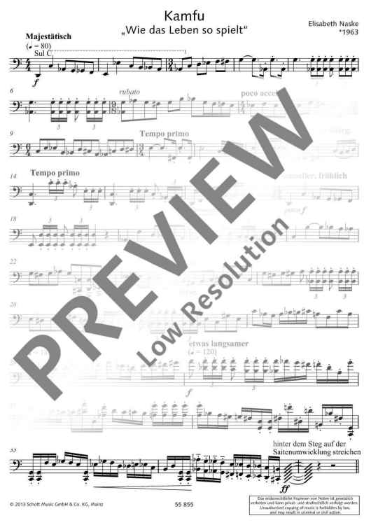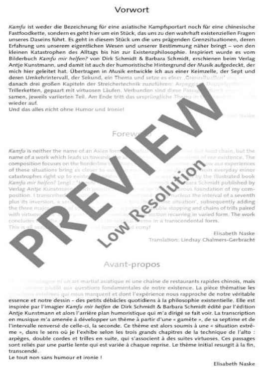 The title goes back to the illustrated book 'Kamfu mir helfen?' by Dirk Schmidt & Barbara Schmidt. The charming story inspired the composer to write music which, according to tradition, is based on the seventh and second intervals, using the common string techniques such as scale, arpeggio, double stop and trill. Naske is one of the most successful female composers in the field of children's theatre. This is why there is a lot of theatricality combined with humour and irony in this virtuoso solo piece, which is also rewarding for viola and violoncello.