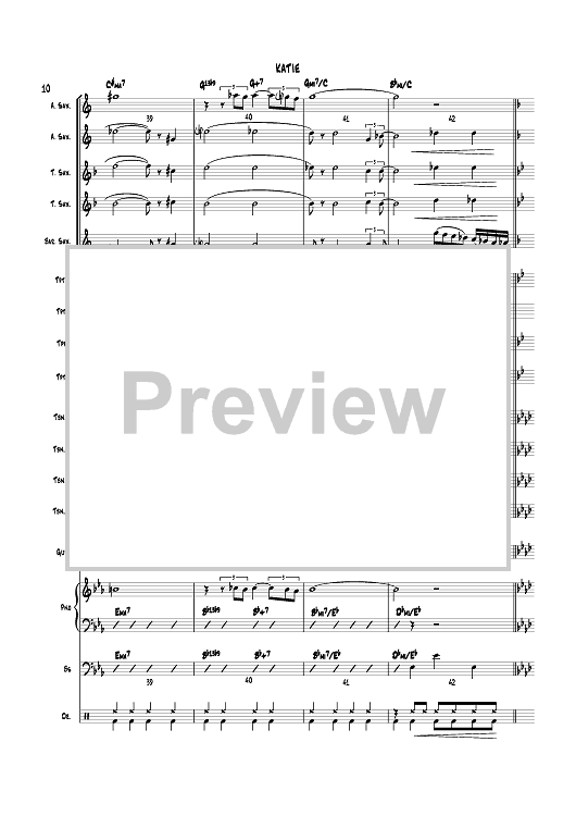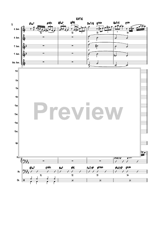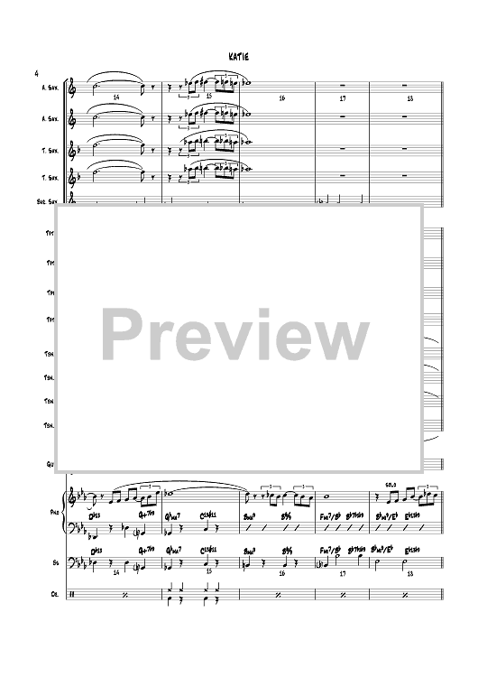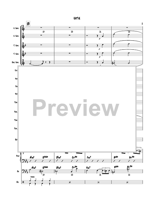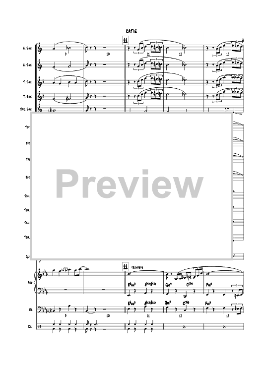 Style: Ballad (Alto Sax Feature) Range: F4 F5 This arrangement of Katie calls for a very “lazy” feel. Keep saxes quiet behind Piano solo at bars 21-25. Work on the "split" triplets at bars 35 and 36. They offer a chance for some very "clean" ensemble work. Very full at measure 43 and back down to a whisper for the ending.
