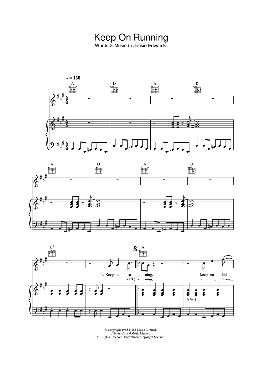 Digital Sheet Music for Keep On Running by The Spencer Davis Group, Jackie Edwards scored for Piano/Vocal/Chords; id:387142