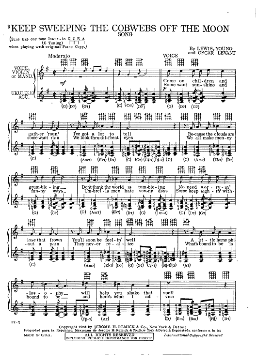 Digital Sheet Music for Keep Sweeping The Cobwebs Off The Moon by , Oscar Levant, E. T. Romeder, Samuel M. Lewis, Joseph Young scored for Ukulele; id:418741