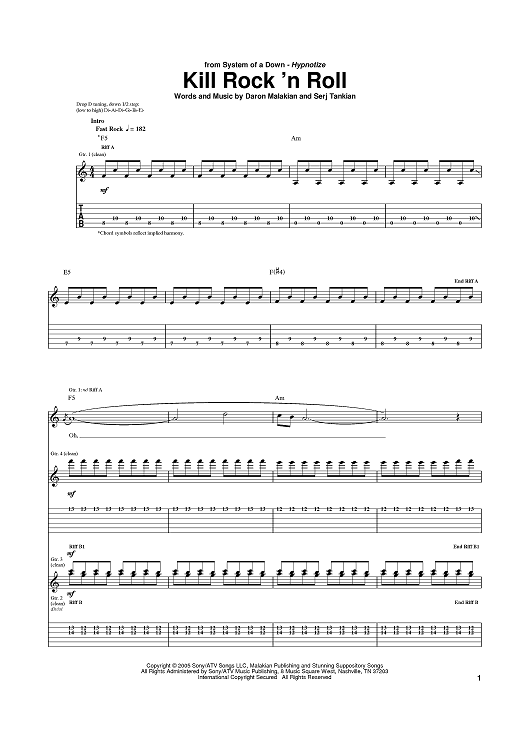 Digital Sheet Music for Kill Rock 'N Roll by Daron Malakian, System Of A Down, Serj Tankian scored for Guitar Tab; id:389428