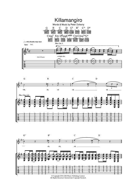 Digital Sheet Music for Killamangiro by Babyshambles, Pete Doherty scored for Guitar Tab; id:391553