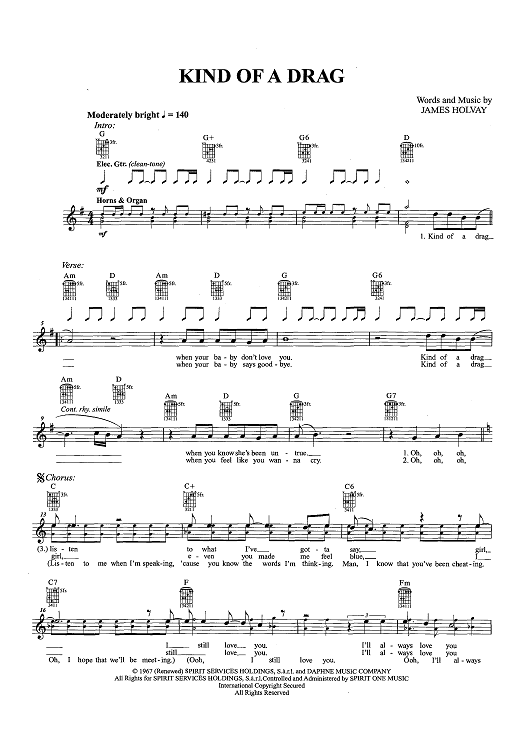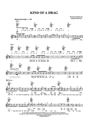 Digital Sheet Music for Kind of a Drag by James Holvay, The Buckinghams scored for Guitar Tab/Vocal/Chords; id:457325