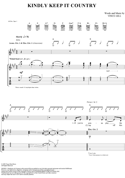 Digital Sheet Music for Kindly Keep It Country by Vince Gill scored for Guitar Tab/Vocal; id:293508