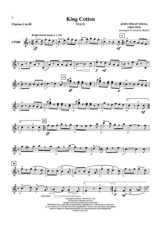 Digital Sheet Music for King Cotton - Clarinet 1 in B-flat by John Philip Sousa, Andrew Balent scored for Concert Band; id:409691