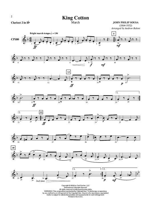 Digital Sheet Music for King Cotton - Clarinet 2 in B-flat by John Philip Sousa, Andrew Balent scored for Concert Band; id:409692