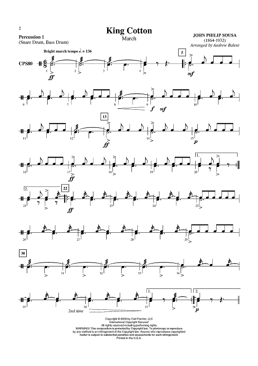 Digital Sheet Music for King Cotton - Percussion 1 by John Philip Sousa, Andrew Balent scored for Concert Band; id:409713