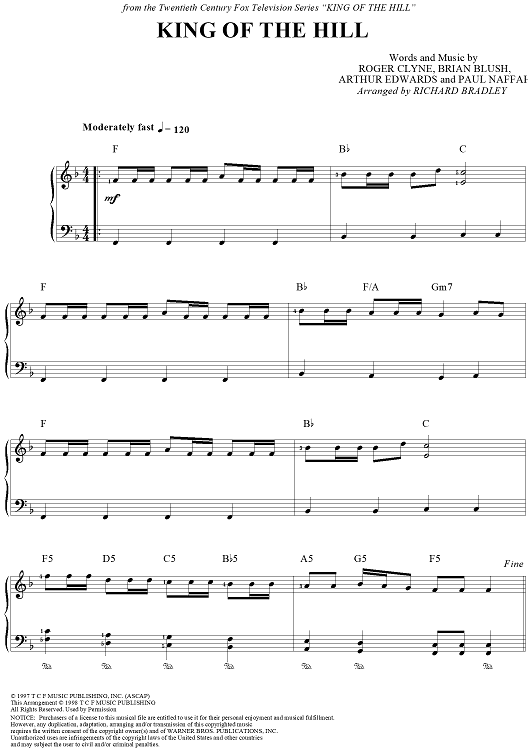 Digital Sheet Music for King of the Hill by Richard Bradley, Roger Clyne, Brian Blush, Arthur Edwards, Paul Naffah scored for Easy Piano; id:118855