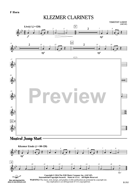 Digital Sheet Music for Klezmer Clarinets - F Horn by Timothy Loest scored for Concert Band; id:445778