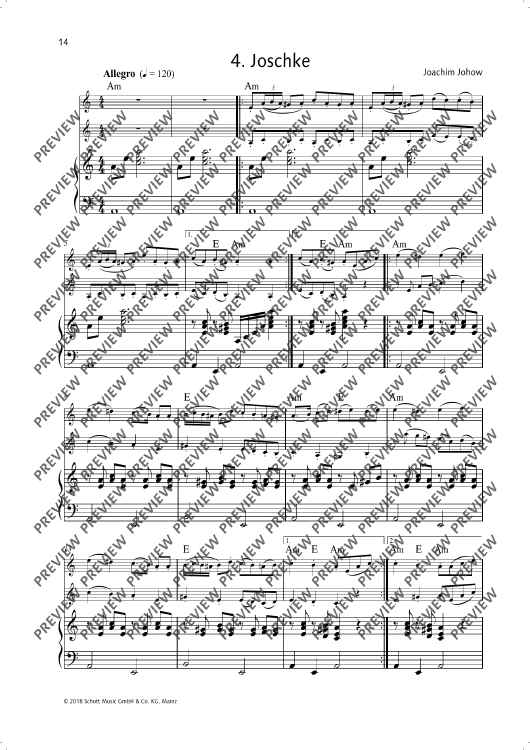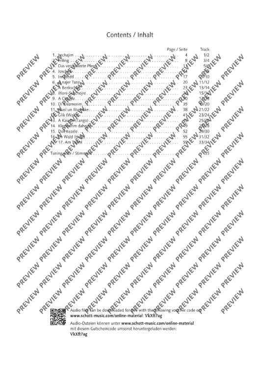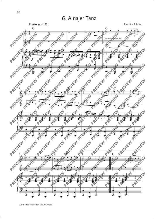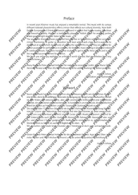 This edition contains klezmer tunes for 1-2 violins with piano accompaniment – sometimes lively and sweeping, sometimes soft and lyrical! Of easy to intermediate difficulty, the pieces are a valuable addition to music lessons and are suitable for both concert performances and music-making at home. If there is no pianist available, the tracks can be used as a ‘duo partner’. In addition, chord symbols allow for accompaniment with the guitar or other instruments. Further editions by Joachim Johow: My Blue Violin (ED 21767), The Merry Fiddler (ED 21768), Coffee & Violin (ED 22670).