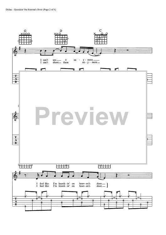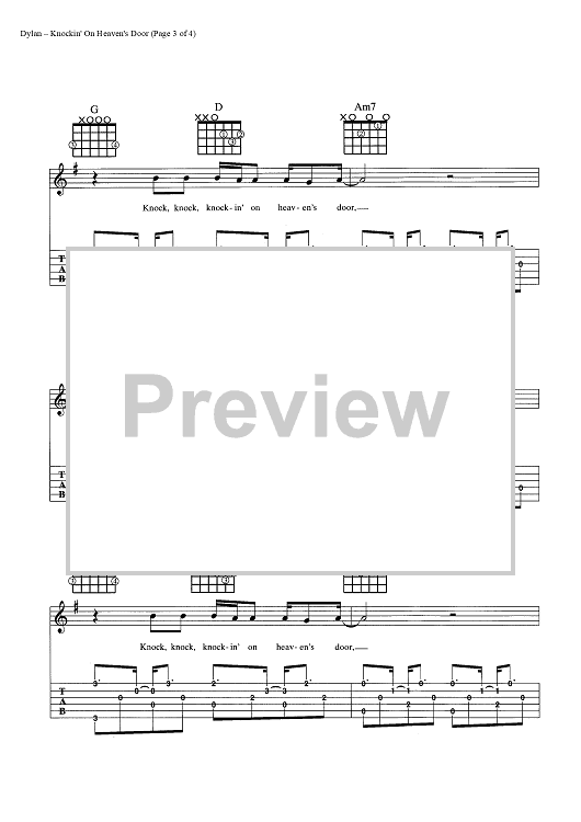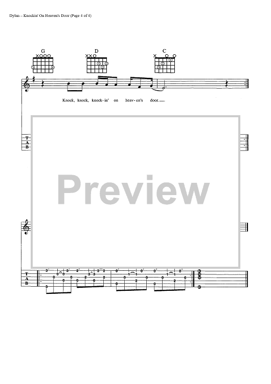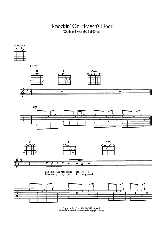 Digital Sheet Music for Knockin' on Heaven's Door by Bob Dylan scored for Guitar Tab/Vocal/Chords; id:445439