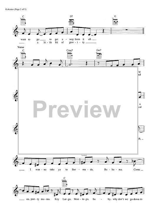 Digital Sheet Music for Kokomo - from the Motion Picture 'Cocktail' by Mike Love, Scott McKenzie, John Phillips, Terry Melcher scored for Ukulele/Vocal; id:465357