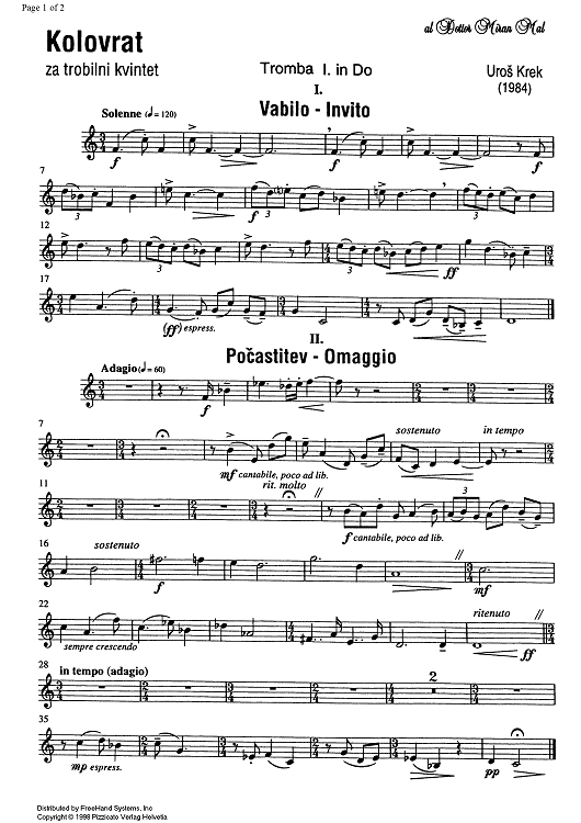 Digital Sheet Music for Kolovrat - Trumpet in C 1 by Uros Krek scored for Brass Quintet; id:353664