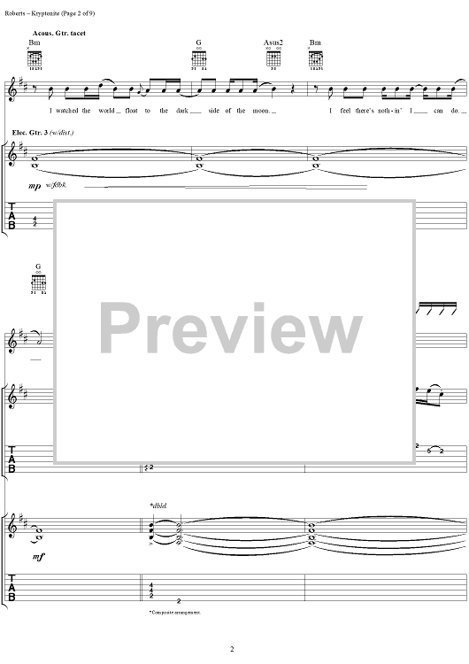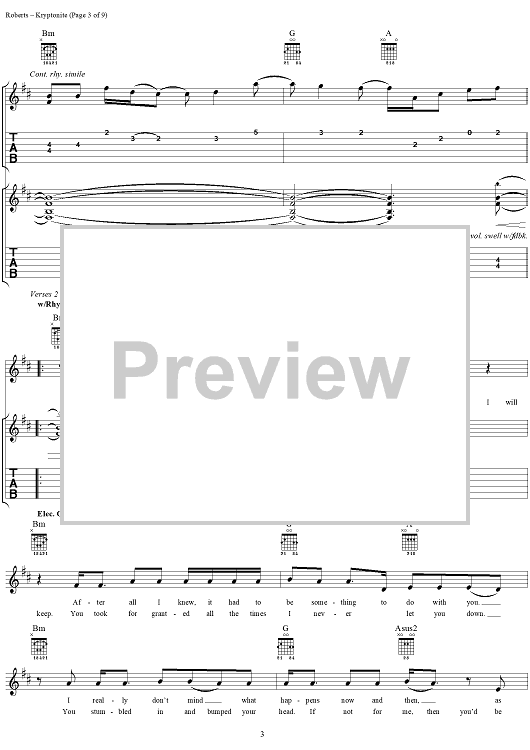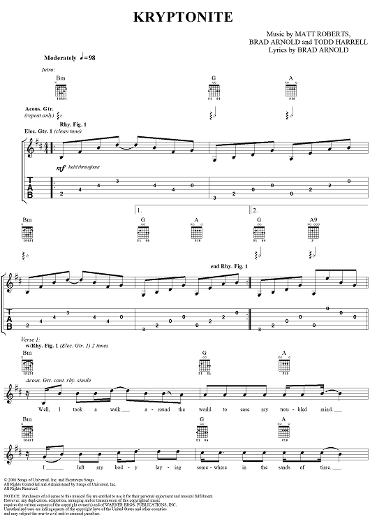 Digital Sheet Music for Kryptonite by 3 Doors Down, Matt Roberts, Brad Arnold, Todd Harrell scored for Guitar Tab/Vocal; id:283472