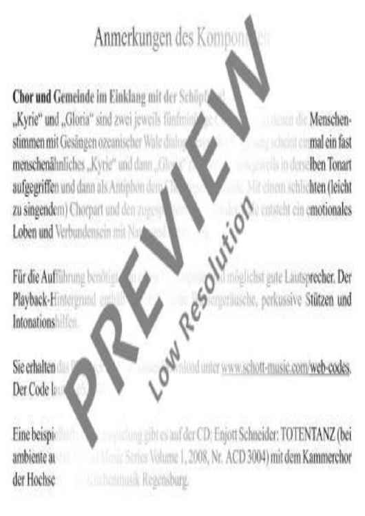 Kyrie und Gloria sind zwei jeweils fünfminütige Chorwerke, in denen die Menschenstimmen mit den Gesängen ozeanischer Wale dialogisieren: der Walgesang scheint einmal ein fast menschenähnliches Kyrie und dann Gloria zu sprechen, was jeweils in derselben Tonart aufgegriffen und dann als Antiphon dem Chor zugeteilt wurde. Mit einem schlichten Chorpart und den zugespielten Gesängen der Wale entsteht ein emotionales Loben und Verbundensein mit Natur und Schöpfung. Für die Aufführung wird ein Playback mit den atmosphärische Wassergeräusche, perkussive Stützen und Intonationshilfen benötigt, das per Webcode auf www.schott-music.com/web-codes kostenlos erhältlich ist. Den entsprechenden Code finden Sie in der Ausgabe. Eine CD-Einspielung „Enjott Schneider, Totentanz“ mit dem Kammerchor der Hochschule für Kirchenmusik Regensburg ist bei ambiente audio erschienen (Sacred Music Series Volume 1, Nr. ACD 3004).