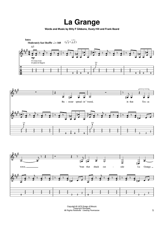 Digital Sheet Music for La Grange by Billy Gibbons, Dusty Hill, Frank Beard, ZZ Top scored for Guitar Tab; id:374331