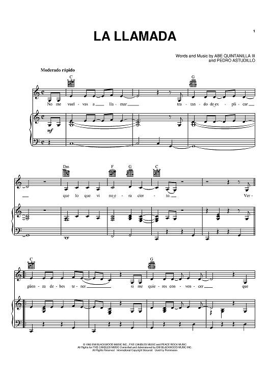 Digital Sheet Music for La Llamada by Pete Astudillo, A.B. Quintanilla III scored for Piano/Vocal/Chords; id:371717