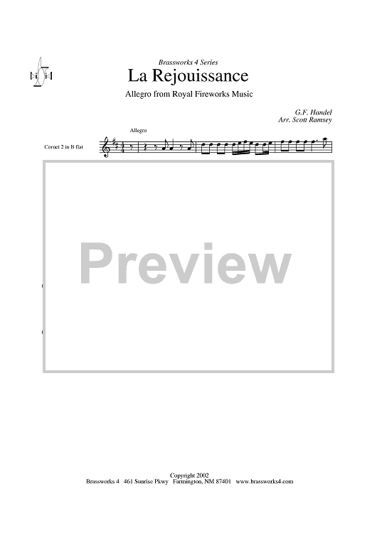 Digital Sheet Music for La Rejouissance - Cornet 2/Trumpet 2 by George Frideric Handel, Scott A. Ramsey scored for Brass Quartet/Timpani; id:316724
