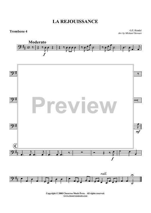 Digital Sheet Music for La Rejouissance - Trombone 4 by , George Frideric Handel, Michael Stewart scored for Brass Ensemble; id:417485