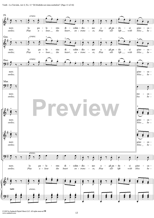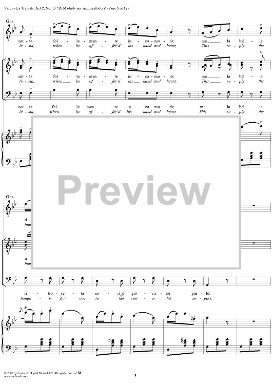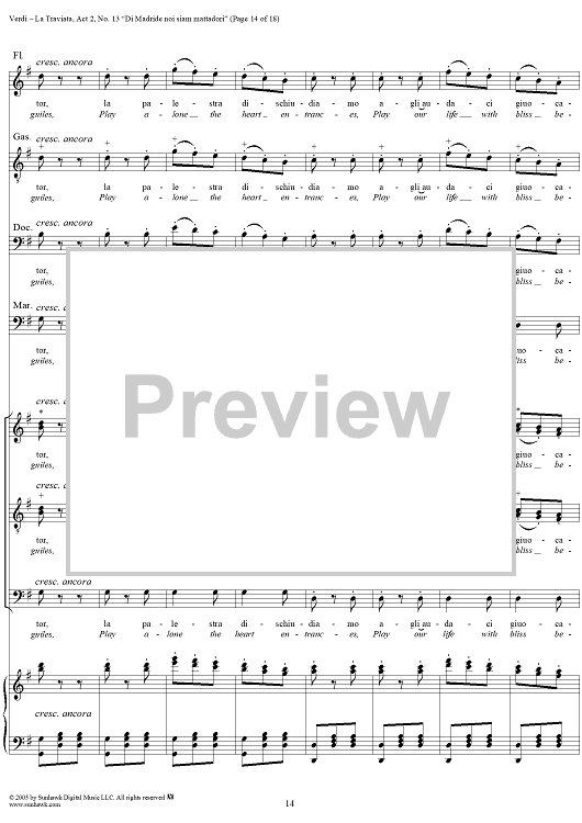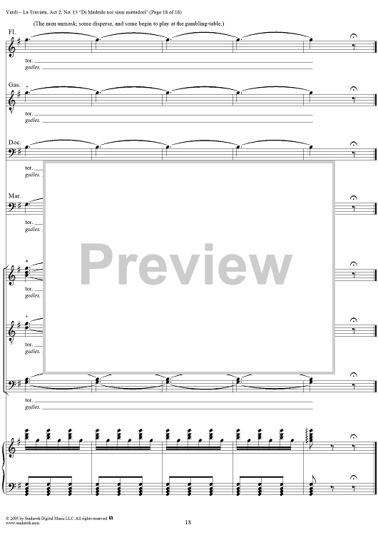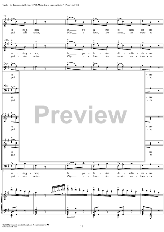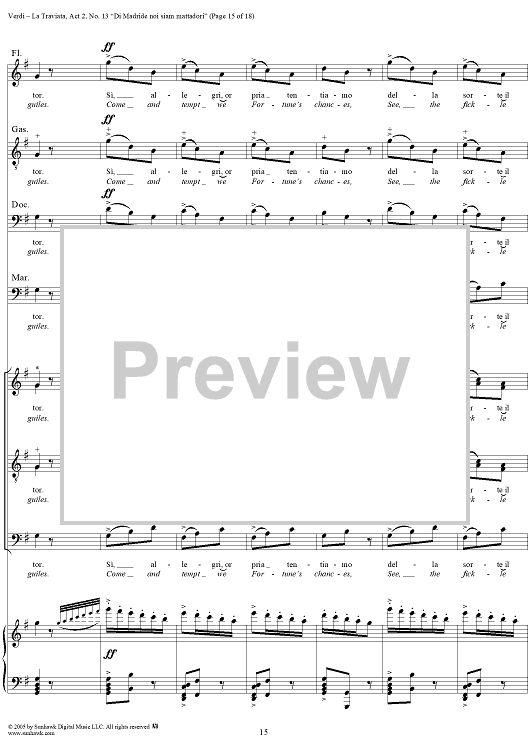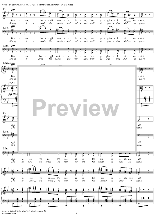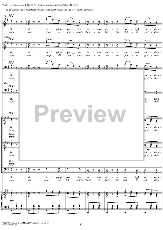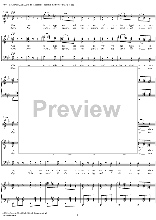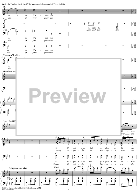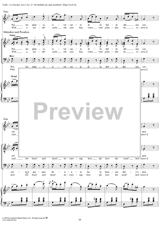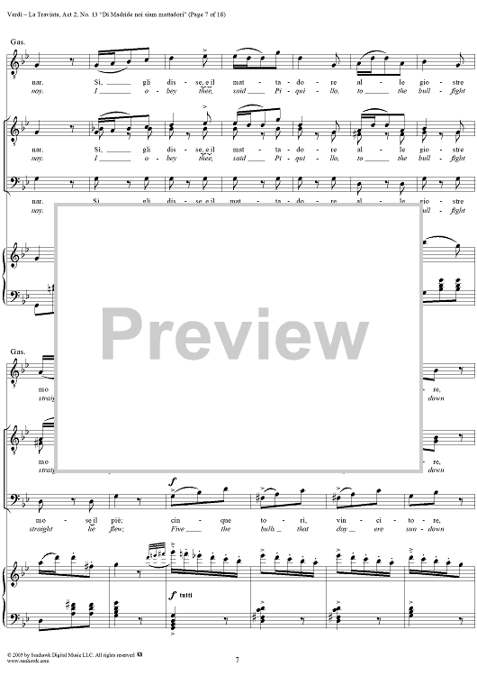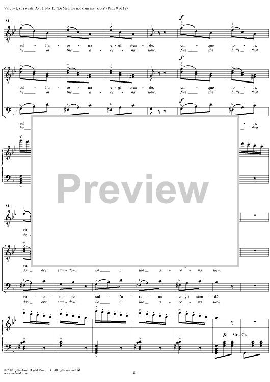 Digital Sheet Music for La Traviata, Act 2, No. 13, Chorus of Matadors. "Di Madride noi siam mattadori" by Giuseppe Verdi scored for Vocal Score; id:304482
