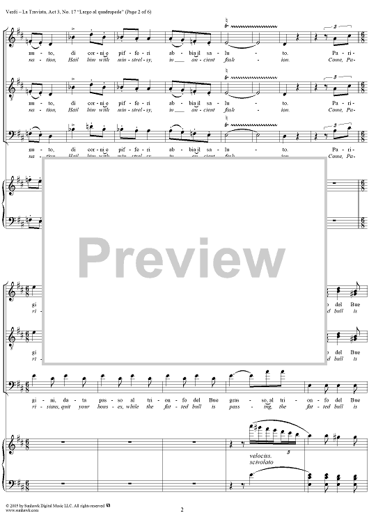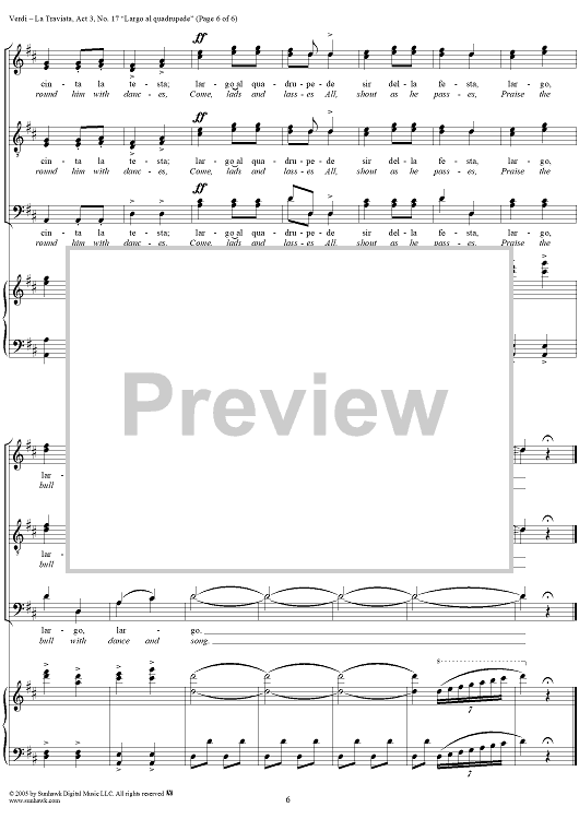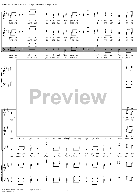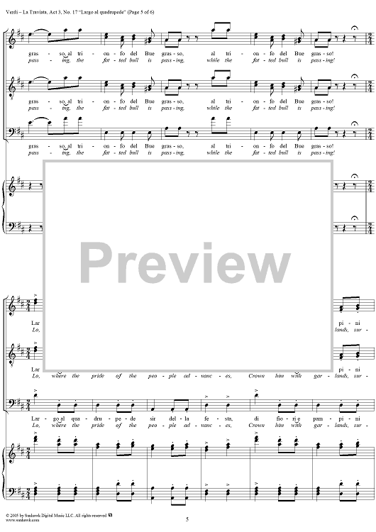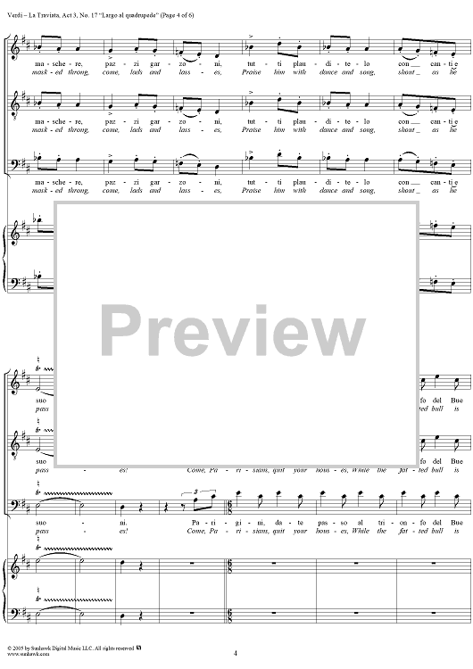 Digital Sheet Music for La Traviata, Act 3, No. 17, Bacchanal Chorus. "Largo al quadrupede" by Giuseppe Verdi scored for Vocal Score; id:304486