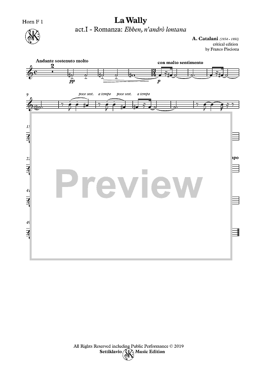 Digital Sheet Music for La Wally - act 1 - Romanza: "Ebben, n'andro lontana" - Horn in F 1 by Alfredo Catalani, Franco Pisciotta scored for Orchestra; id:505539