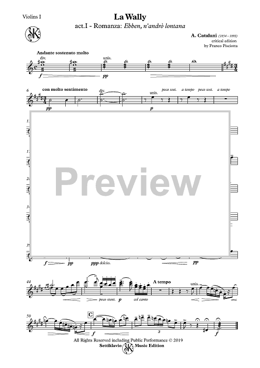 Digital Sheet Music for La Wally - act 1 - Romanza: "Ebben, n'andro lontana" - Violin 1 by Alfredo Catalani, Franco Pisciotta scored for Orchestra; id:505546