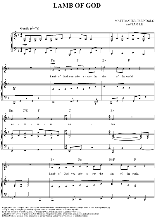 Digital Sheet Music for Lamb Of God by Matt Maher, Ike Ndolo, Tam Le scored for Piano/Vocal/Chords; id:441572