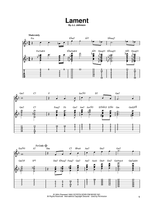 Digital Sheet Music for Lament by Kenny Burrell, J.J. Johnson scored for Easy Guitar Tab; id:375087