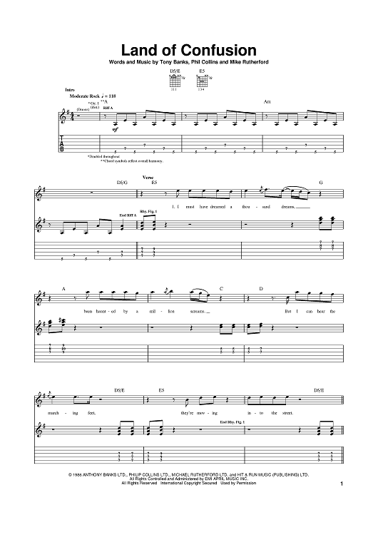 Digital Sheet Music for Land Of Confusion by Genesis, Mike Rutherford, Tony Banks, Phil Collins scored for Guitar Tab; id:370983