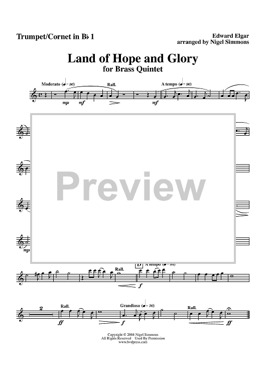 Digital Sheet Music for Land of Hope and Glory - Trumpet 1 by Nigel Simmons, Edward Elgar scored for Brass Quintet; id:311793