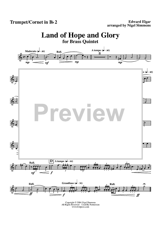 Digital Sheet Music for Land of Hope and Glory - Trumpet 2 by Nigel Simmons, Edward Elgar scored for Brass Quintet; id:311794