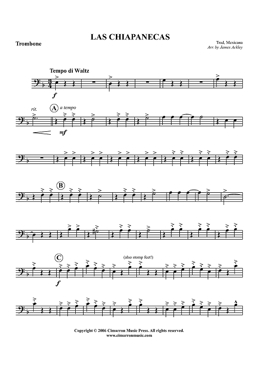 Digital Sheet Music for Las Chiapanecas - Trombone by James Ackley, Traditional Mexicana scored for Brass Quintet; id:321474