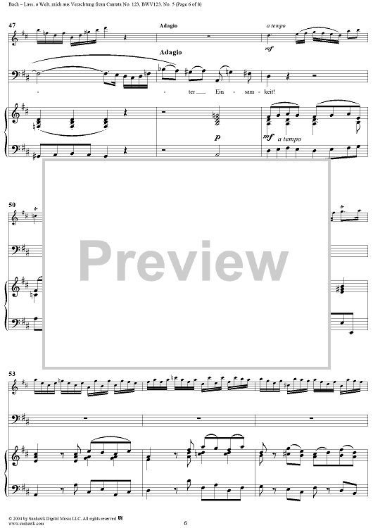 Digital Sheet Music for "Lass, o Welt, mich aus Verachtung", Aria, No. 5 from Cantata No. 123: "Liebster Immanuel, Herzog der Frommen" - Piano Score by Johann Sebastian Bach scored for Bass, Flute and Piano or Organ; id:303718