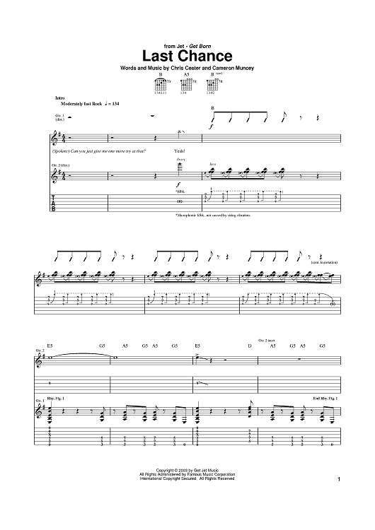 Digital Sheet Music for Last Chance by Chris Cester, Jet, Cam Muncey scored for Guitar Tab; id:374957