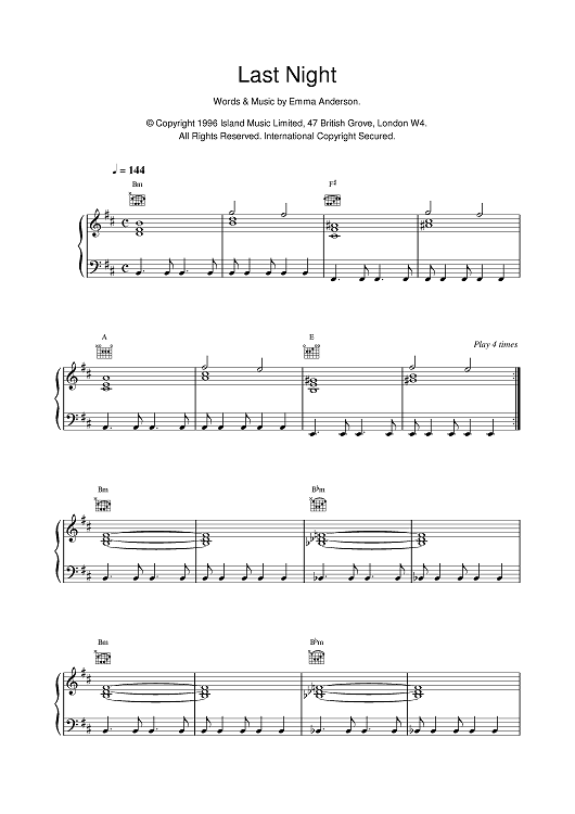 Digital Sheet Music for Last Night by Emma Anderson, Lush scored for Piano/Vocal/Chords; id:379730