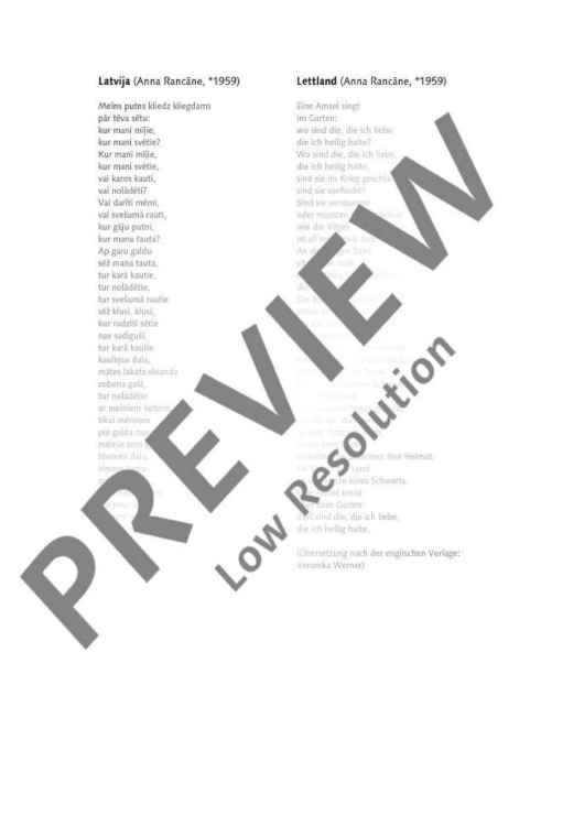 In metamophorisch dichten Bildern beschreibt Anna Rancane in ihrem Gedicht Latvija die vergangenen Leiden und zurückgebliebenen Wunden des lettischen Volkes durch Krieg und Besetzung. Peteris Vasks hat diesen Text einfühlsam in Musik gesetzt und zudem congenial eine zweite Ebene voll sensibler Klänge geschaffen.