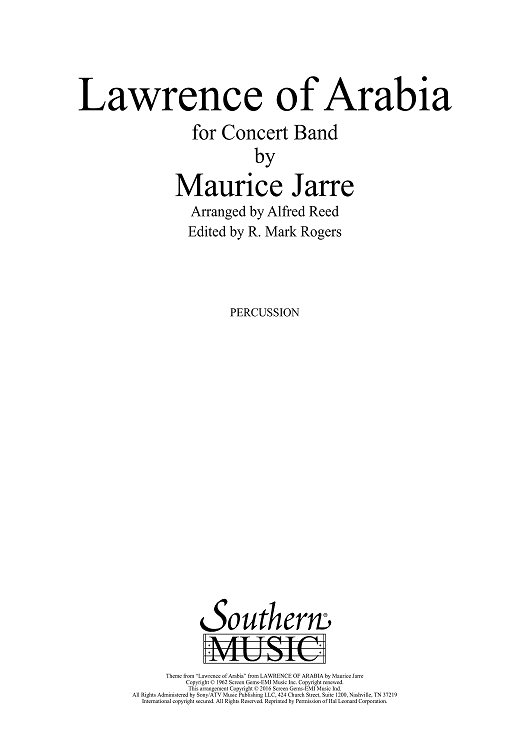 David Lean’s epic film “Lawrence of Arabia” was nominated for ten Academy Awards and won seven, including Best Original Score for Maurice Jarre’s masterful musical depiction of the exotic world through which T.H. Lawrence passed. Alfred Reed’s setting of the music for concert band, available here for the first time in full score with newly edited parts, is built on two of the main themes: the Arabian motif, with its blazing color and almost-barbaric effects; and the Lawrence theme, a haunting, poignant melody that reflects both his love of the desert and his internal, psychological conflicts.