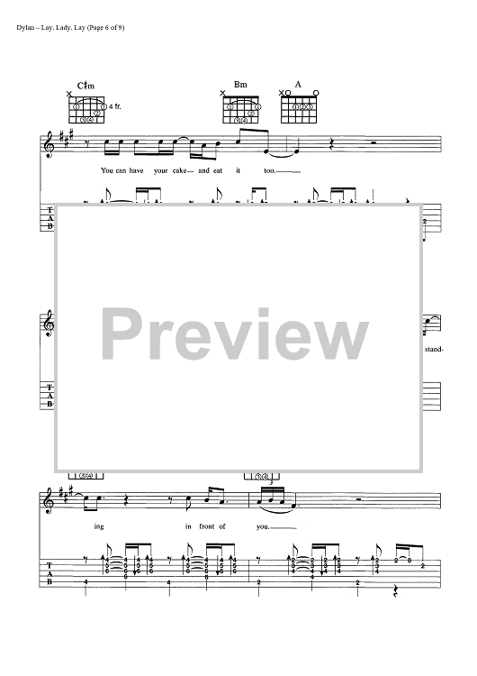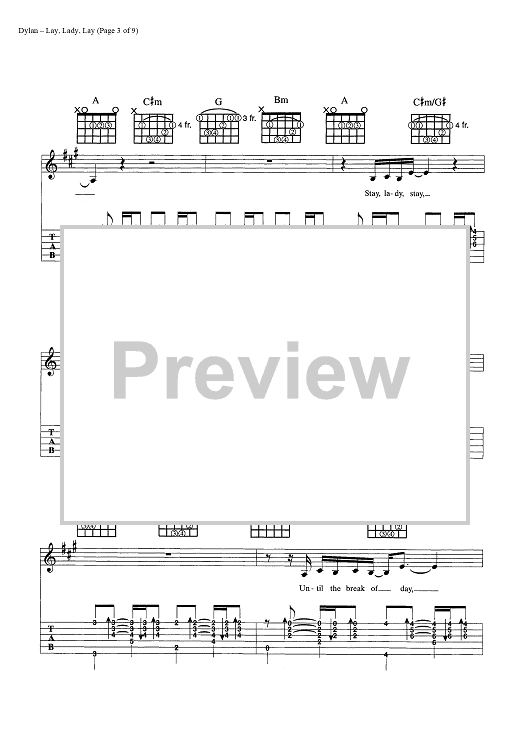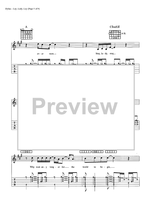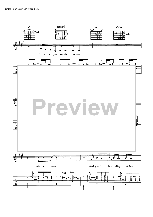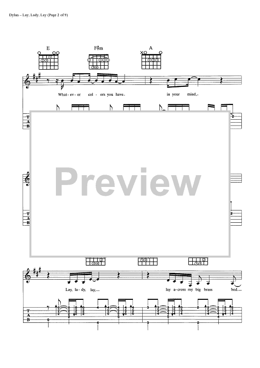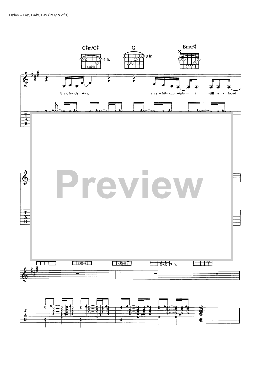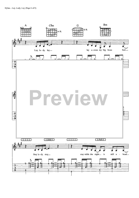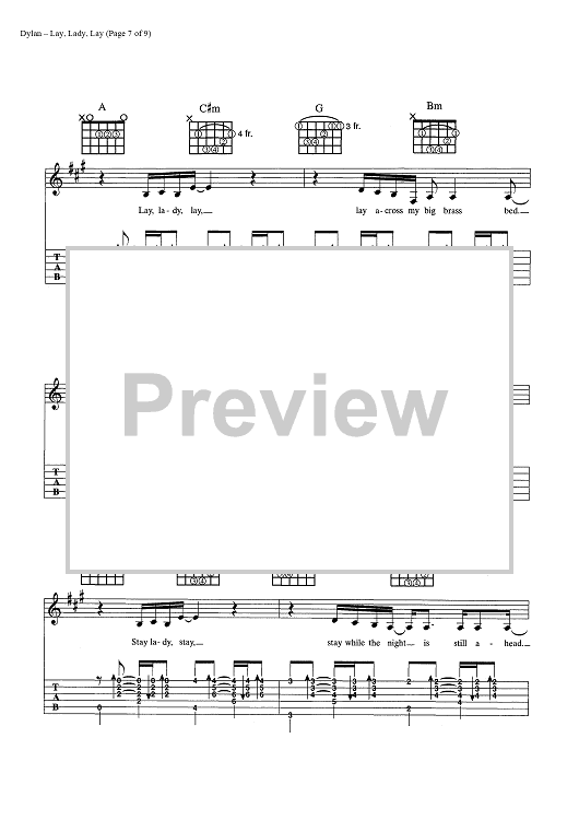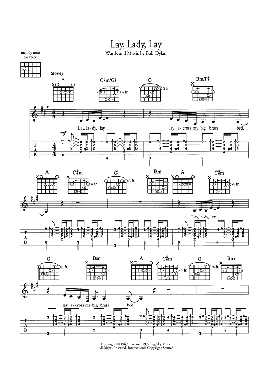 Digital Sheet Music for Lay, Lady, Lay by Bob Dylan scored for Guitar Tab/Vocal/Chords; id:445440