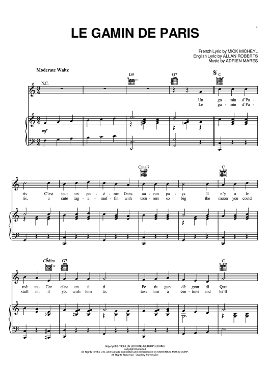 Digital Sheet Music for Le Gamin De Paris by Allan Roberts, Adrien Mares, Mick Micheyl scored for Piano/Vocal/Chords; id:395251