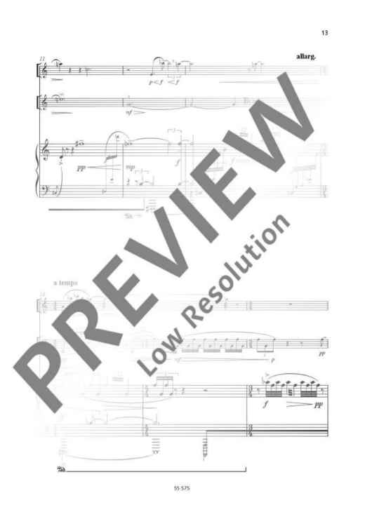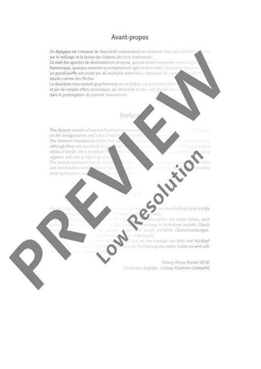 This diptych consists of two brief contrasting movements which however have a common focus on the amalgamation and fusion of tonal colour in the three instruments.The harmonic foundations of the first movement are provided by ring modulation spectrums although these are also based on equal-tempered tuning in semitones. In the manner of a deep intake of breath, life is breathed into the first movement through numerous clashes, contrasting registers and runs at lightning speed.The second movement has an unmistakable focus on tonal colouring and the concept of echo and reverberation complemented by simple acoustic effects, unfolding a substantially extended tonal spectrum in continuation of the first movement.