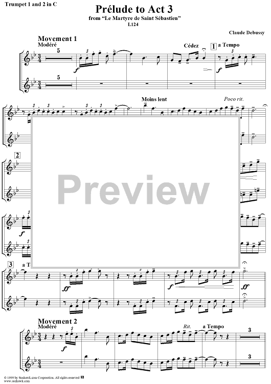 Digital Sheet Music for Le Martyre de Saint Sébastien: Prélude to Act 3 - Trumpet 1 in C/Trumpet 2 in C by Claude Debussy scored for Brass Ensemble; id:187328