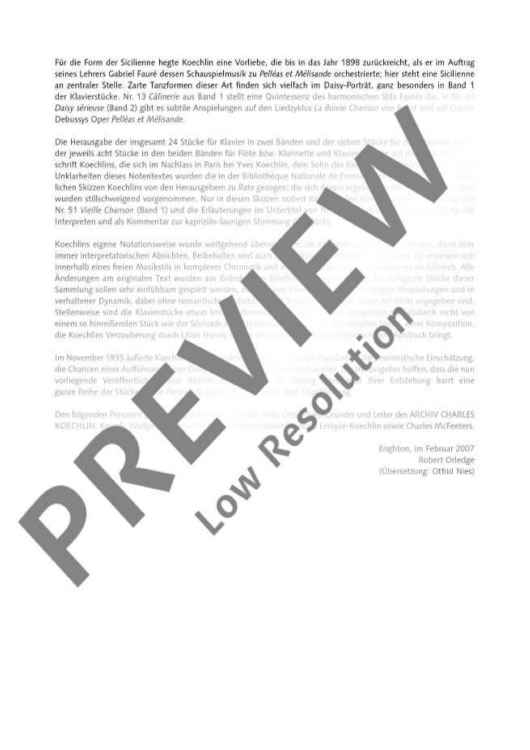 Endlich ist die Musik von Charles Koechlin kein Geheimtipp mehr, sondern wird sowohl für den Konzertsaal als auch die CD entdeckt! Mit unserer Ausgabe präsentieren wir nun eine weithin noch unbekannte Facette seines Schaffens. Denn kaum jemand weiß, dass sich Koechlin in bereits fortgeschrittenem Alter dem Film zuwandte. Obwohl Koechlin bewusst war, dass keine Aussicht auf filmische Umsetzung bestand, entwarf er sogar ein Filmszenario in 20 Szenen, in dem er selbst in einer Doppelrolle erscheinen sollte! Im Alter von 66 Jahren sah er in einem Pariser Filmtheater die Schauspielerin Lilian Harvey als Prinzessin Marie-Christine in Princesse à vos ordres. Er war so verzaubert, dass er für sie die kleinen Stücke Le Portrait de Daisy Hamilton komponierte – hinreißende Miniaturen, die nicht als Filmmusik geschrieben, sondern durch Filmerlebnisse ausgelöst wurden. Von den unvollendet gebliebenen, auf zwei bis vier Linien notierten Kompositionen Le Portrait de Daisy Hamilton sind bei Schott bereits drei Hefte erschienen, nun publizieren wir zwei Bände mit je acht Stücken für Flöte und Klavier bzw. für Klarinette und Klavier. Zwei weitere Hefte (11 Stücke für Klavier und Streichquartett und 10 Stücke für Streichsextett) werden noch folgen. Mit den insgesamt sieben geplanten Heften werden Charles Koechlins letzte noch unveröffentlichte Werke aus dem Umfeld des Films endlich für die Nachwelt zugänglich.