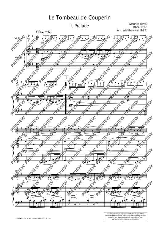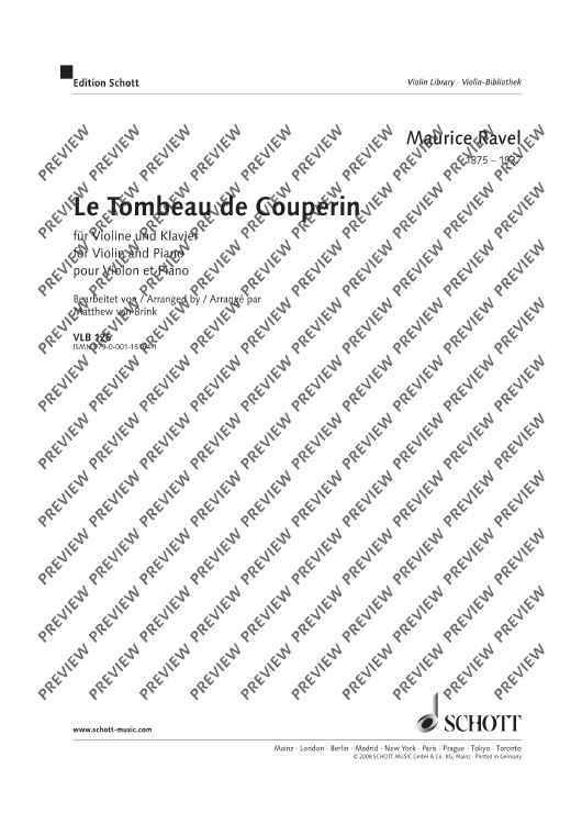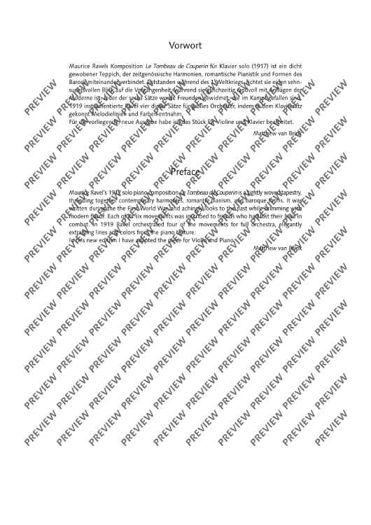 Created during the First World War, Maurice Ravel's composition 'Le Tombeau de Couperin' casts a longing look at the past while at the same time being full to the brim with traces of modern music. Each of the six movements is dedicated to friends who died in battle. In 1919 Ravel arranged four of these movements for large orchestra by skilfully borrowing melodic lines and colours from the piano setting. Matthew van Brink arranged this wonderful work for violin and piano.