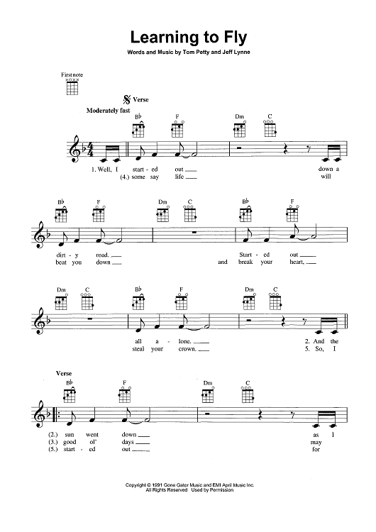 Digital Sheet Music for Learning To Fly by Tom Petty, Jeff Lynne scored for Ukulele/Vocal; id:465373