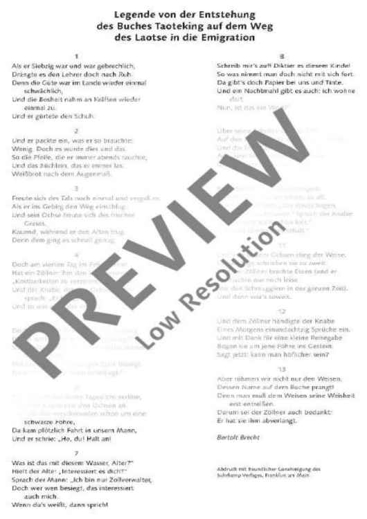 Jüngstes Ergebnis der langen Beschäftigung des Komponisten mit Bertolt Brechts Werken ist die Vertonung der berühmten "Legende von der Entstehung des Buches Taoteking", deren bekannteste Aussage ist, "dass das Wasser in Bewegung mit der Zeit den mächtigen Stein besiegt". Mit der Vortragsbezeichnung "Im Ton eines Bänkelliedes" ist zwar ein Hinweis auf eine Anlehnung auch an den "Songstil" z. B. Kurt Weills gegeben; die ganz eigene Handschrift des Komponisten bleibt jedoch unverkennbar.