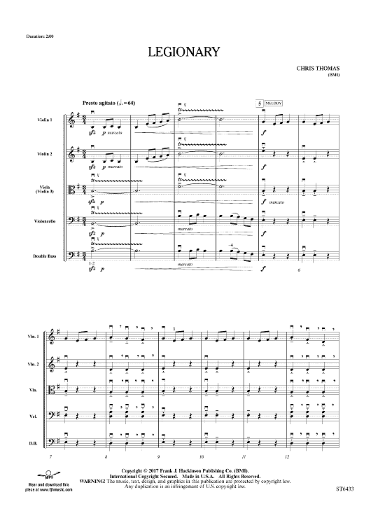 Travel back in time to the era of the Roman legionary as you experience music that portrays the rugged and exciting story of a Roman soldier. The piece features brawny marcato bowings, simple syncopations, bold ostinato rhythms and tension-building trills. Powerful moments are passed throughout the ensemble in this adventurous addition to your next concert program! (2:00)