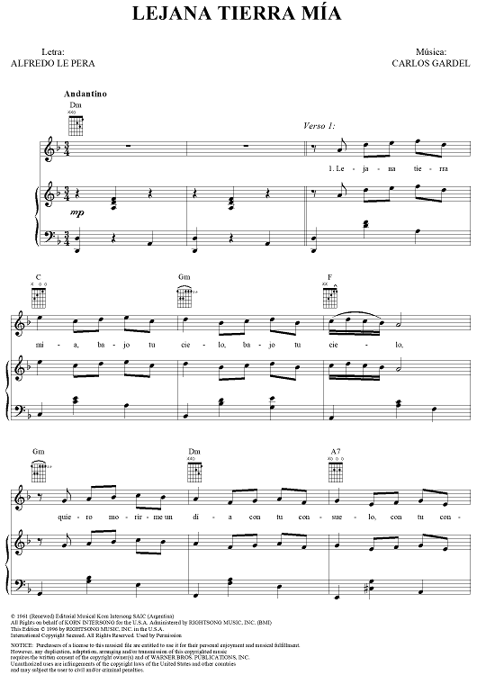 "Lejana Tierra Mía" Sheet Music by Carlos Gardel