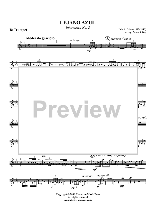 Digital Sheet Music for Lejano Azul - B-flat Trumpet by James Ackley, Luis A. Calvo scored for Trumpet/Piano; id:321491
